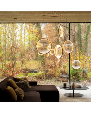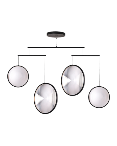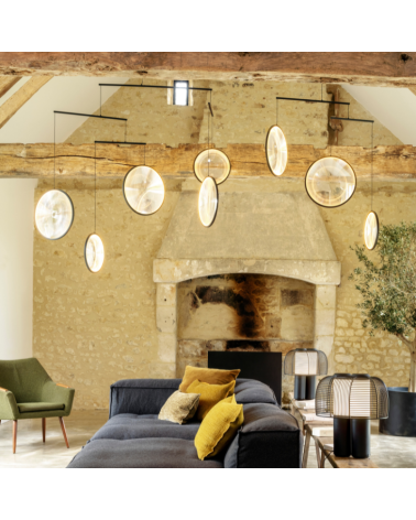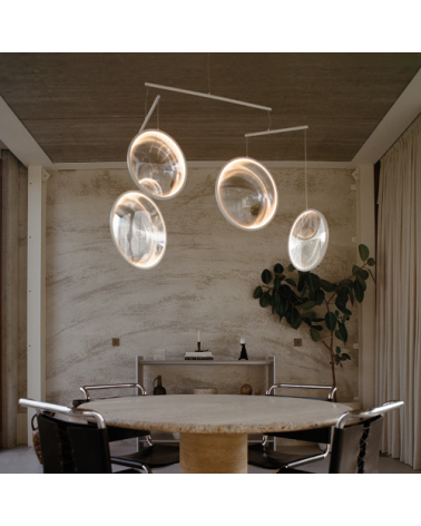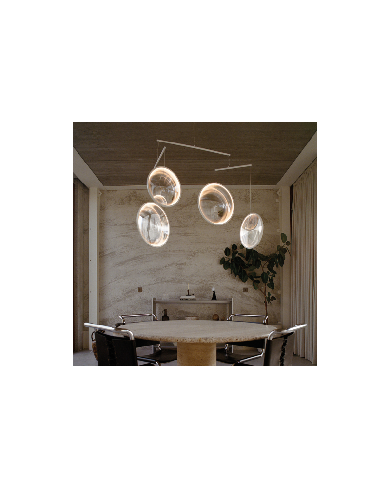 Légère et élégante, la suspension Focus diffuse une lumière chaude à travers ses disques flottants.
