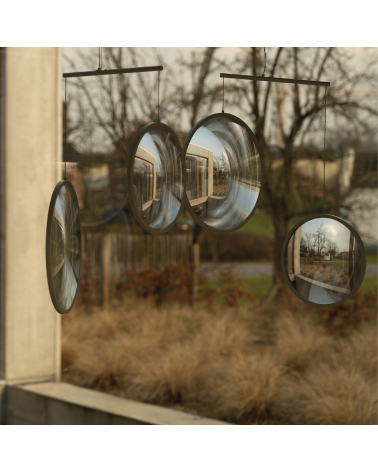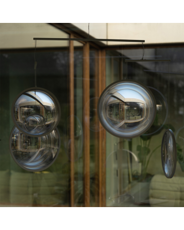 Effet aérien unique : les disques captent et reflètent la lumière comme des bulles en mouvement.